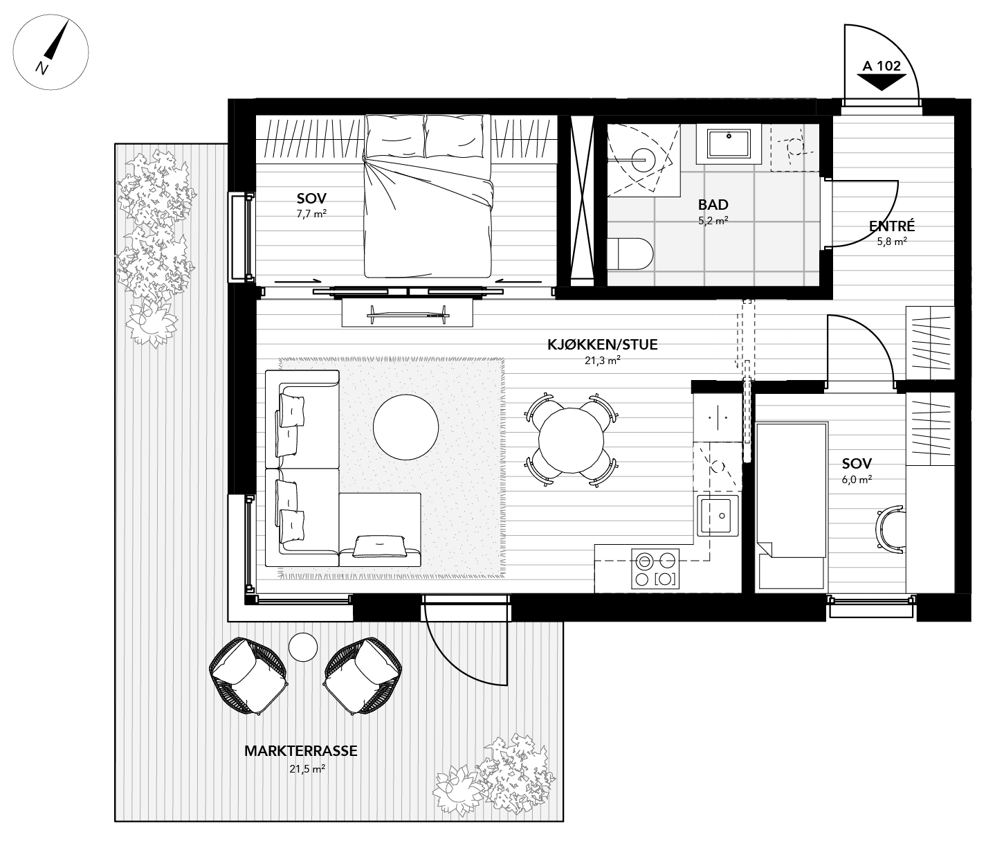 Smart 3-roms leilighet med sørvestvendt markterrasse på hele 21,5 kvm. Leiligheten inneholder en romslige entre, 2 flotte soverom, pent flislagt bad og åpen stue/kjøkken løsning.