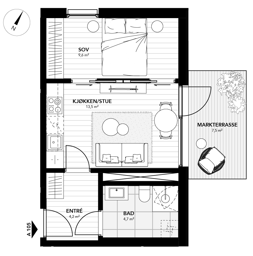 Arealeffektiv 2-roms som inneholder romslig entre, pent flislagt bad, soverom og åpen stue/kjøkken løsning med utgang til østvendt markterrasse.