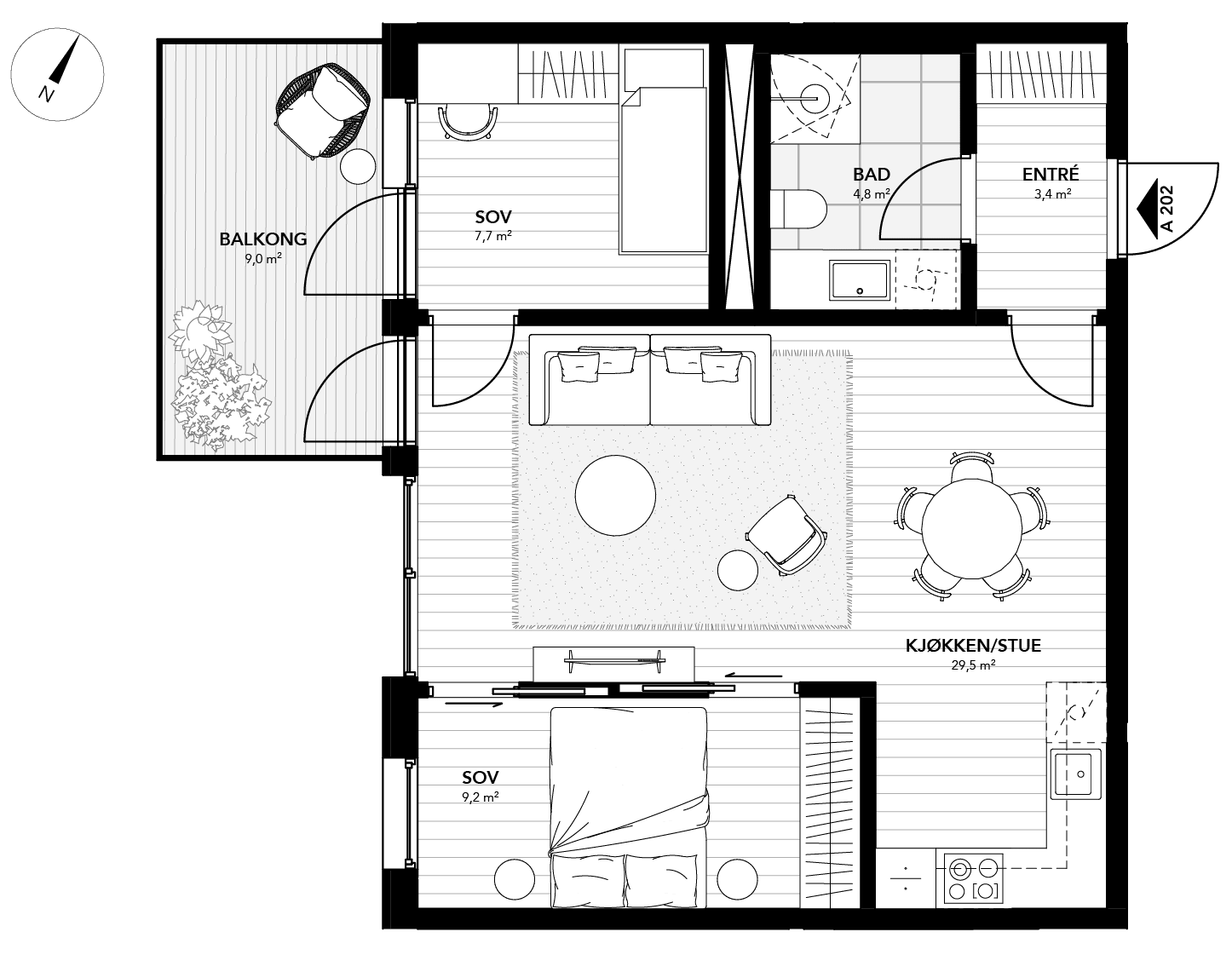 Meget fin 3-roms leilighet med sørvest solrik markterrasse. Leiligheten inneholder entre med god plass til garderobe, pent flislagt bad, 2 soverom samt en åpen stue/kjøkken løsning hvor kjøkkenet ligger skjermet til.