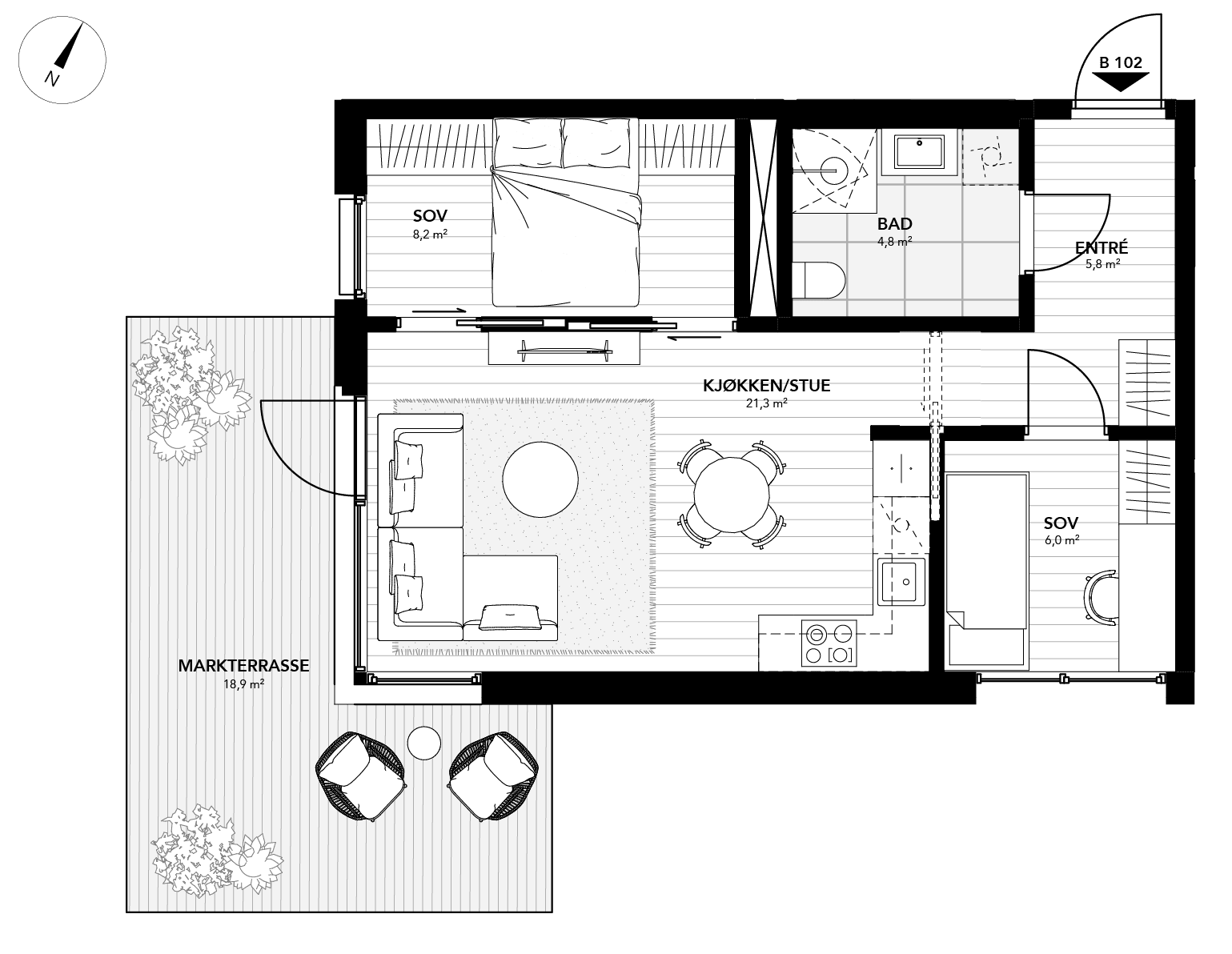 Smart 3-roms leilighet med solrik markterrasse på hele 18,9 kvm som er vendt sørvest. Leiligheten inneholder en romslige entre, 2 flotte soverom, pent flislagt bad og åpen stue/kjøkken løsning.