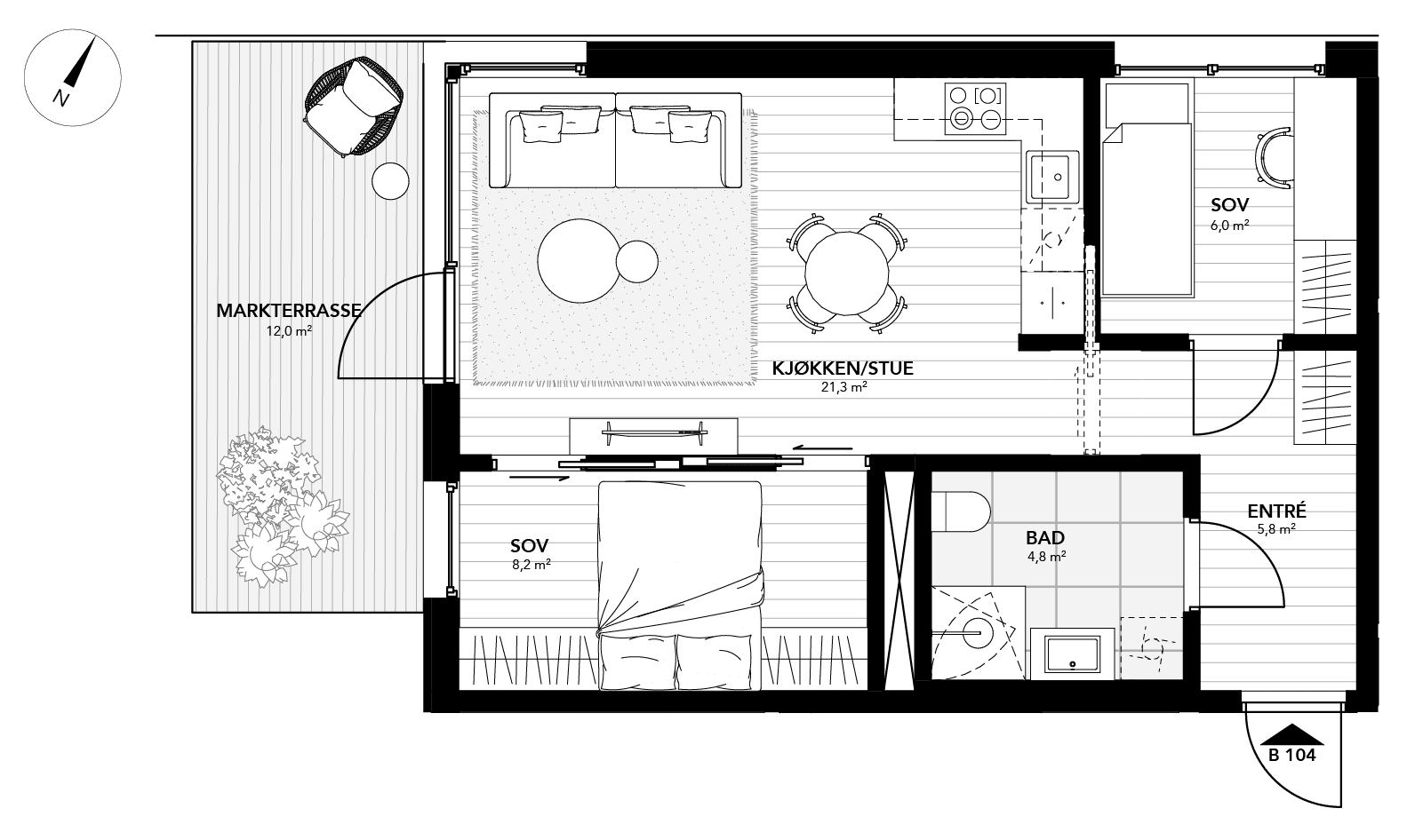Smart 3-roms leilighet med solrik markterrasse på 12 kvm som er vendt sørvest. Leiligheten inneholder en romslige entre, 2 flotte soverom, pent flislagt bad og åpen stue/kjøkken løsning.