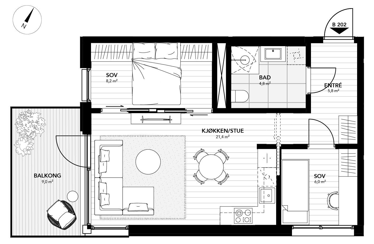 Flott 3-roms som inneholder romslig entre, pent flislagt bad, 2 soverom og åpen stue/kjøkken løsning med utgang til en romslig sørvendt balkong på 9 kvm.