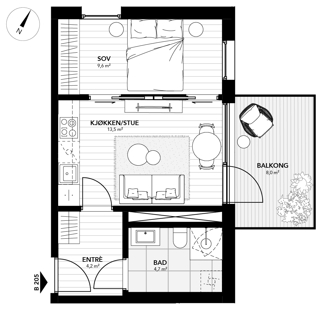 Arealeffektiv 2-roms som inneholder romslig entre, pent flislagt bad, soverom og åpen stue/kjøkken løsning med utgang til en romslig sørvendt balkong på 8 kvm.