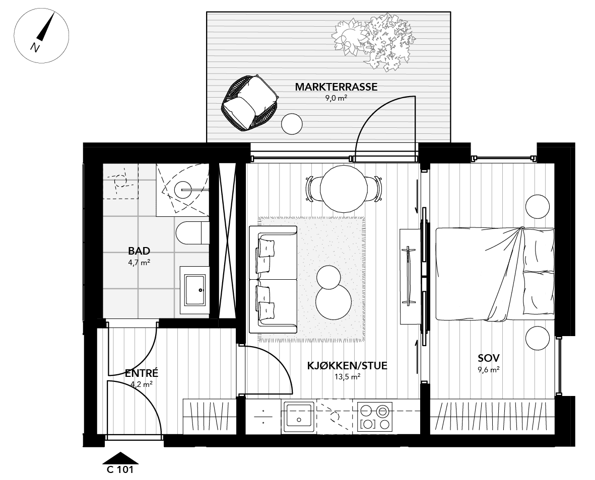 Arealeffektiv 2-roms som inneholder romslig entre, pent flislagt bad, soverom og åpen stue/kjøkken løsning med utgang til en romslig nordvest-vendt markterrasse på 9 kvm.