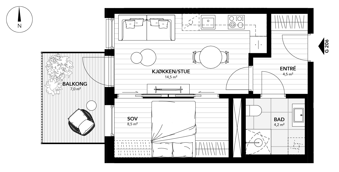 Arealeffektiv 2-roms der man har plass til det man trenger. Se på den gode planløsningen!