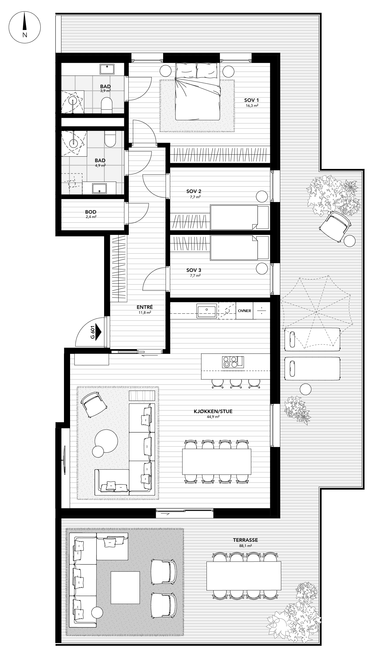 Takterrassen har tre soner, der den største er vendt mot sør. Leiligheten har innvendig bod og sportsbod i kjeller.